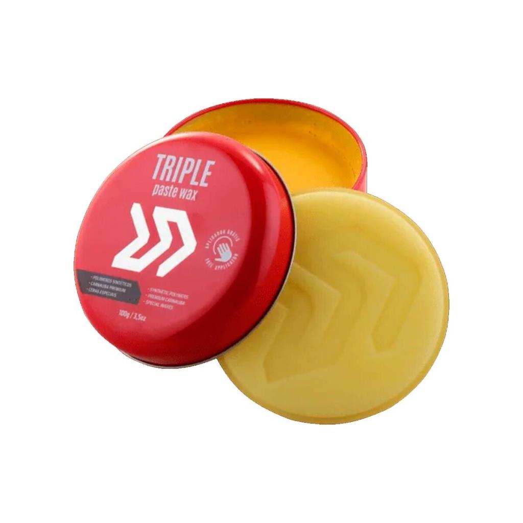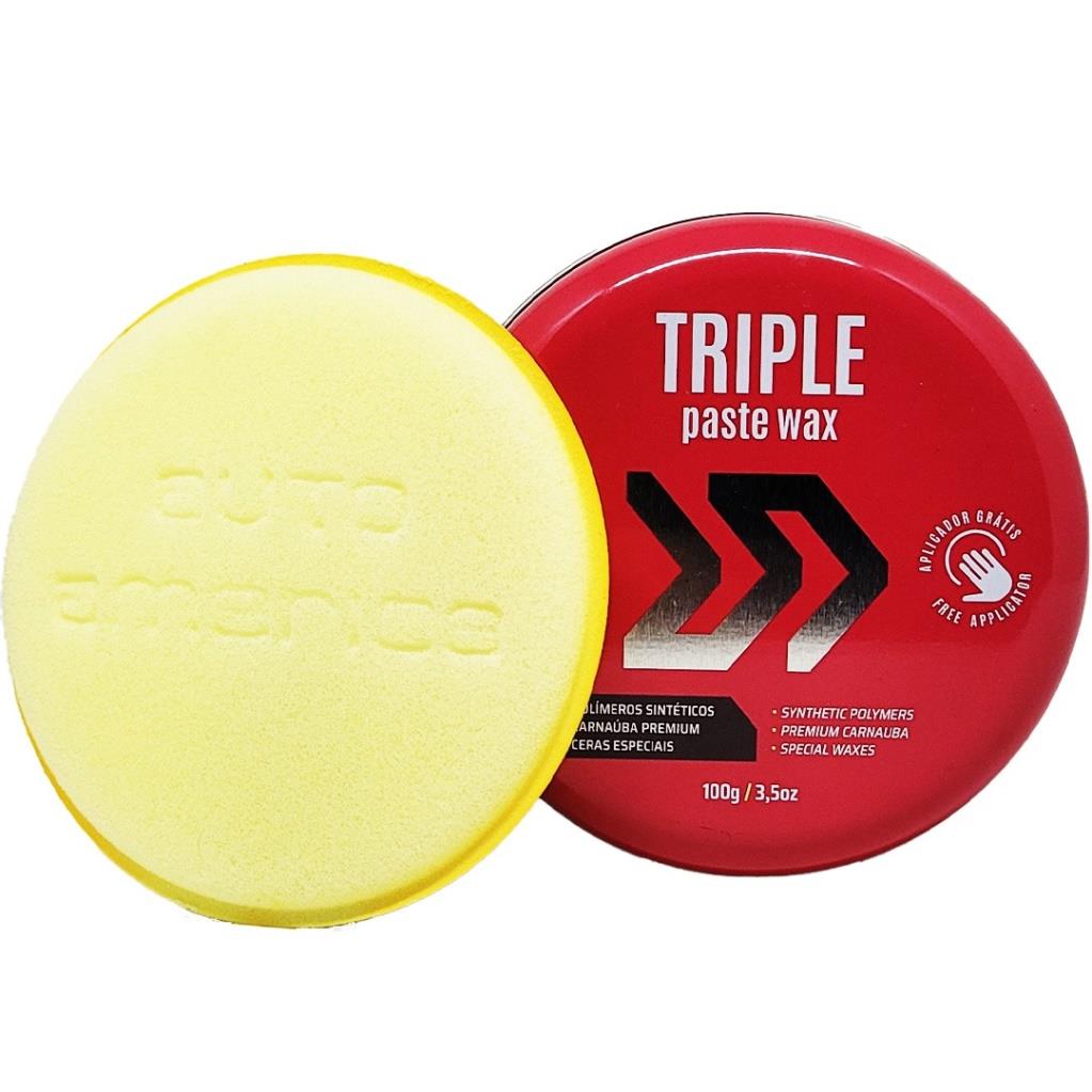 TRIPLE PASTE WAX é uma cera 3 em 1, que combina polímeros sintéticos, carnaúba super premium e ceras especiais. Oferece fácil aplicação e remoção, altíssimo rendimento e proteção ultra resistente. Disponível nos tamanhos de 100 e 300 gramas