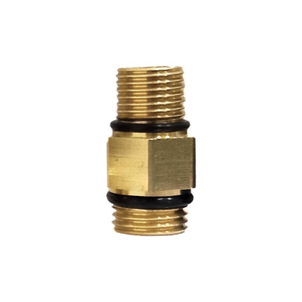 Adaptador modelo rosca 1/4, para uso em canhão de espuma, vindo com um dos lados rosca macho G1/4M, para acoplar o canhão de espuma ou outros produtos com esta rosca, no outro lado vem com rosca M14 para uso em outros adaptadores com esse modelo de rosca.