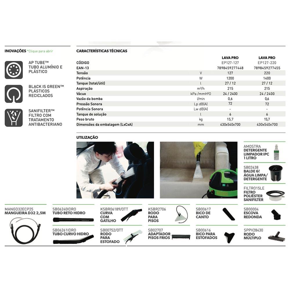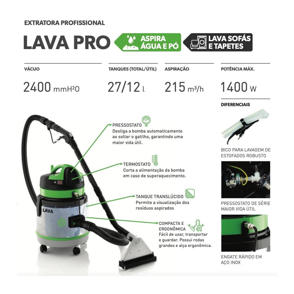 A Lava PRO é a nova extratora da IPC para uso profissional. Acompanha pressostato de série, que desliga a bomba quando o gatilho é solto. Isso evita que a bomba continue funcionando durante os períodos de inatividade, o que aumenta sua vida útil e produtividade. Seu tanque translúcido permite a visualização dos resíduos aspirados. O equipamento funciona com a injeção de água com detergente na superfície, seguida da aspiração terminando na limpeza total. A Lava PRO também possui uma completa linha de acessórios robustos para lavagem e aspiração, além do filtro Sanifilter, que garantem a qualidade do serviço.