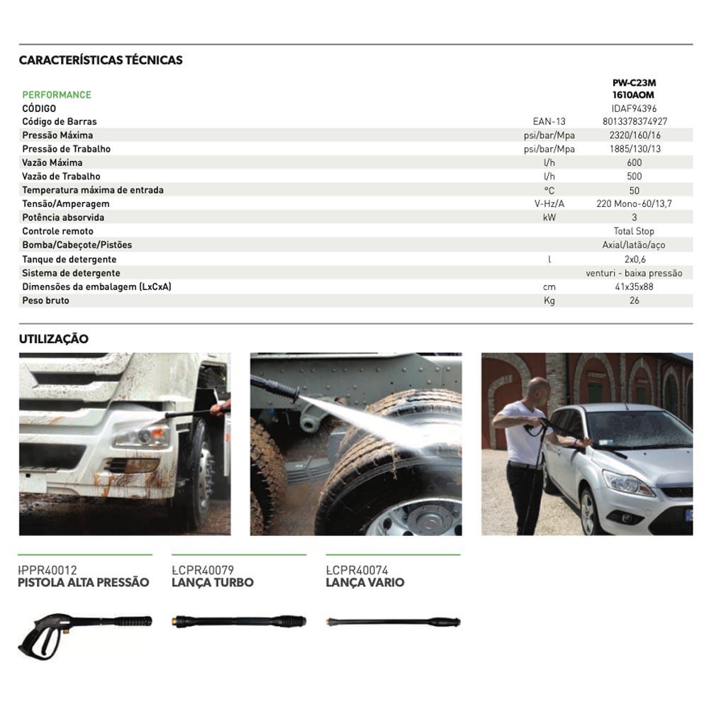 Lavadora de alta pressão na versão monofásica. Possui bomba axial com cabeçote em latão de alta durabilidade. Carretel para mangueira de série e manômetro para verificação da pressão real de trabalho. Suporte a detergente com dois tanques integrados. Mangueira de alta pressão de 12 metros.