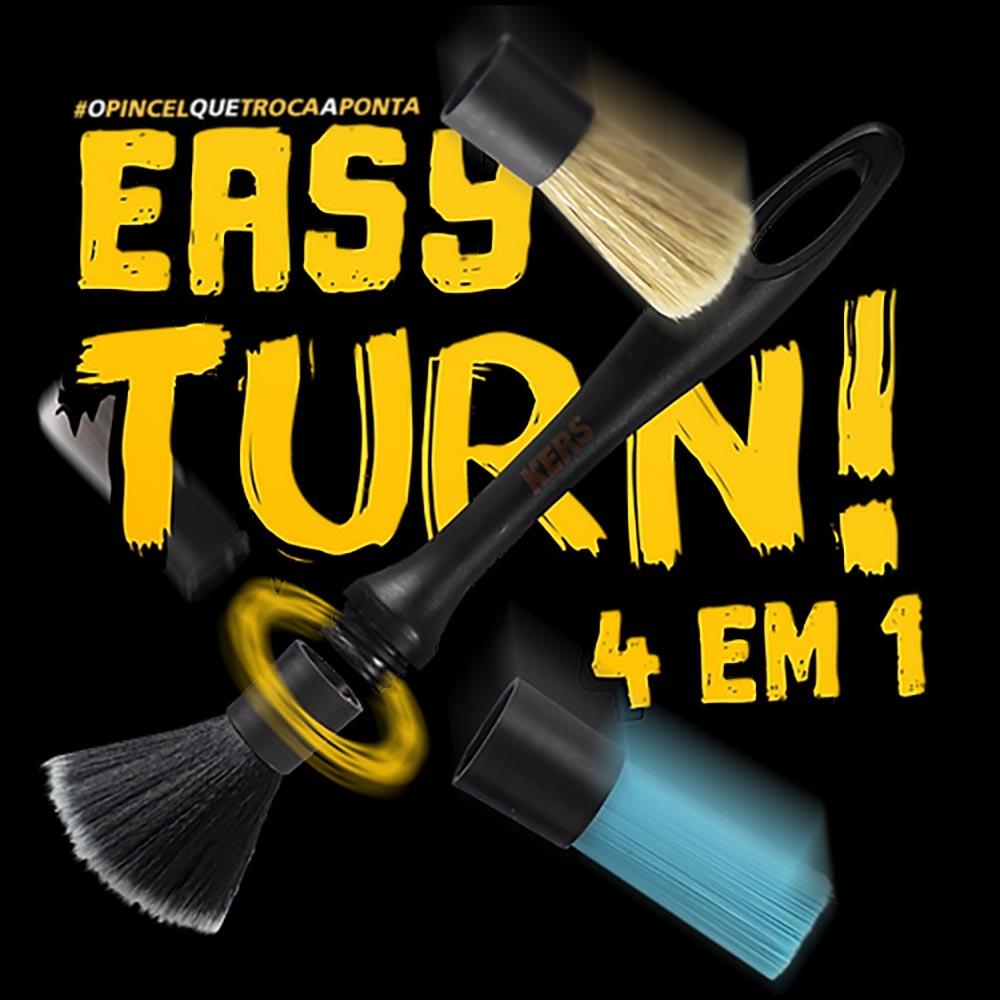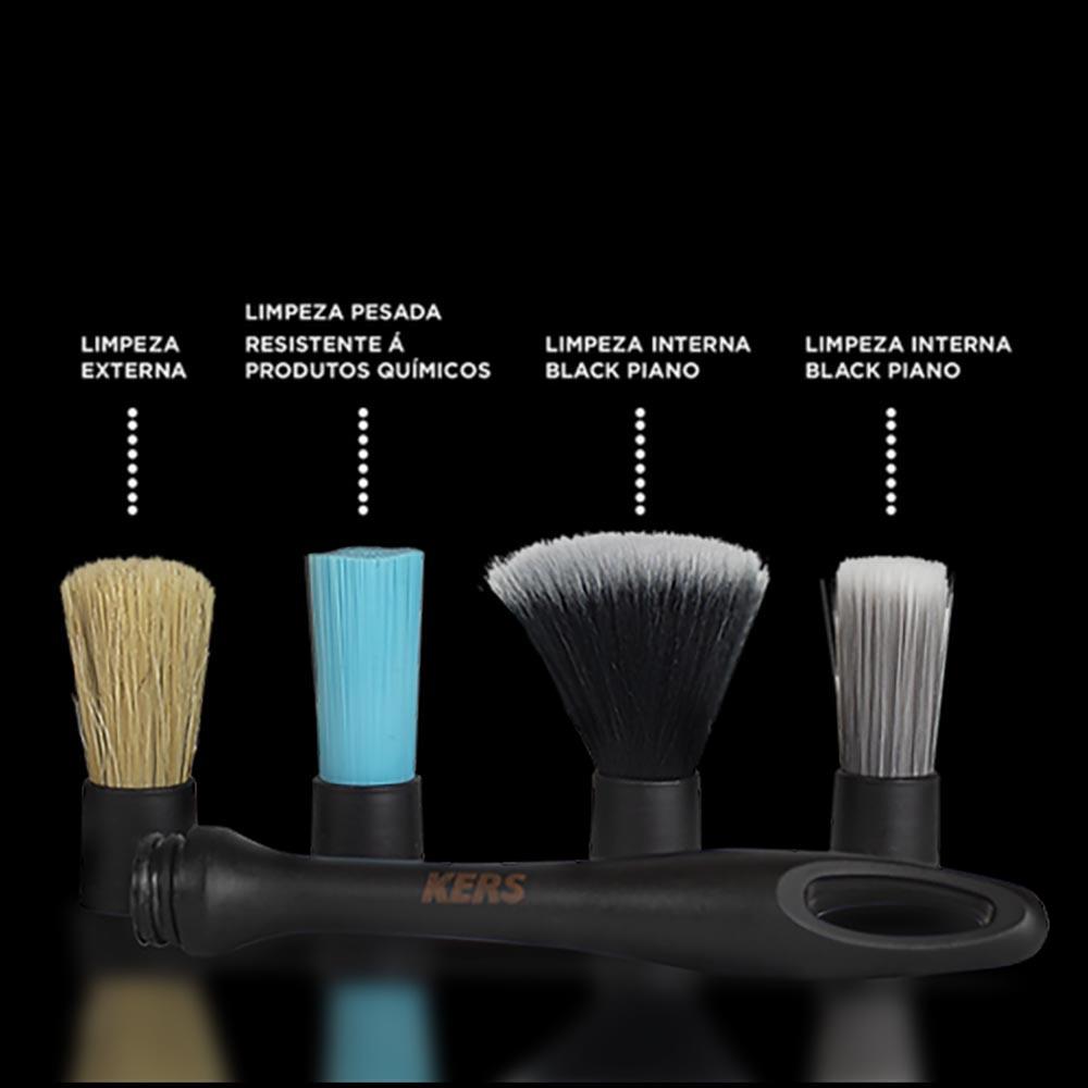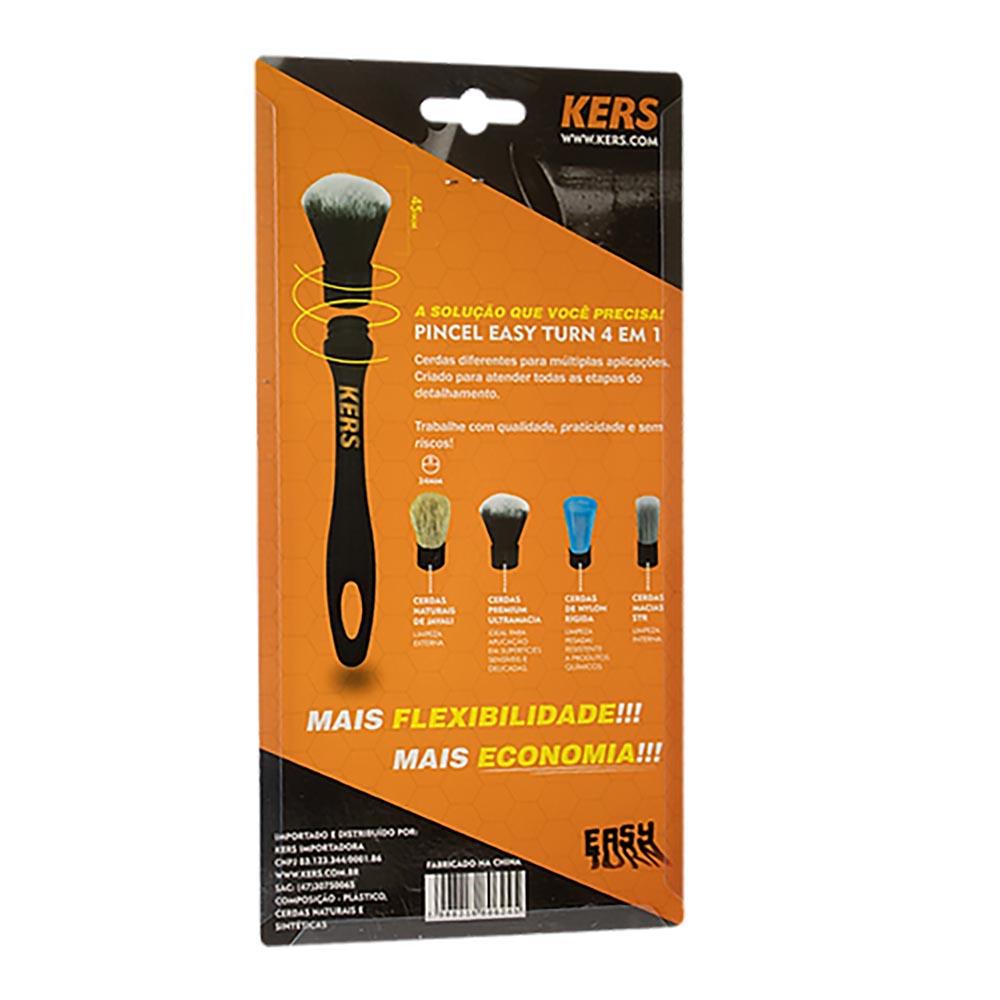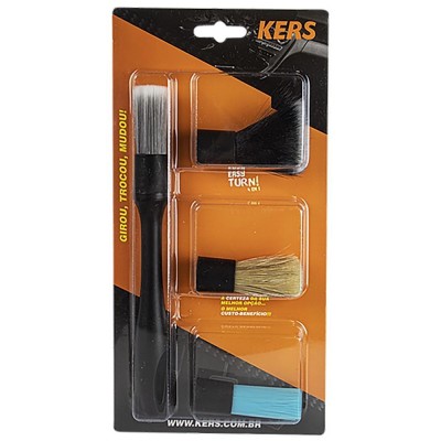 O Pincel Kers easy turn - Pincel que troca as cerdas, possui um kit de 4 diferentes tipos de cerdas para toda a etapa do detalhamento: Cerdas macias premium para partes mais delicadas como black piano, cerdas de nylon resistentes a produtos químicos para aquela etapa que requer mais esfregação, cerdas naturais para limpeza externa e cerdas macias longas.