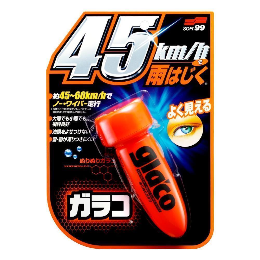 Poderoso repelente de água para pára-brisas. Desenvolvido e testado no laboratório da Soft99 Corporations  no Japão, Glaco é um incrível repelente de água para vidros e para-brisas de automóveis, caminhões e ônibus. Quando aplicado no vidro, o ultra repelente Glaco forma uma fina e resistente camada transparente que repele completamente a água da chuva, dispensando até mesmo o uso do limpador de pára-brisas mesmo debaixo de temporais, aumentando consideravelmente a visibilidade e a formação de películas oleosas no pára-brisas, o que resulta em maior conforto e segurança para motorista e passageiros.