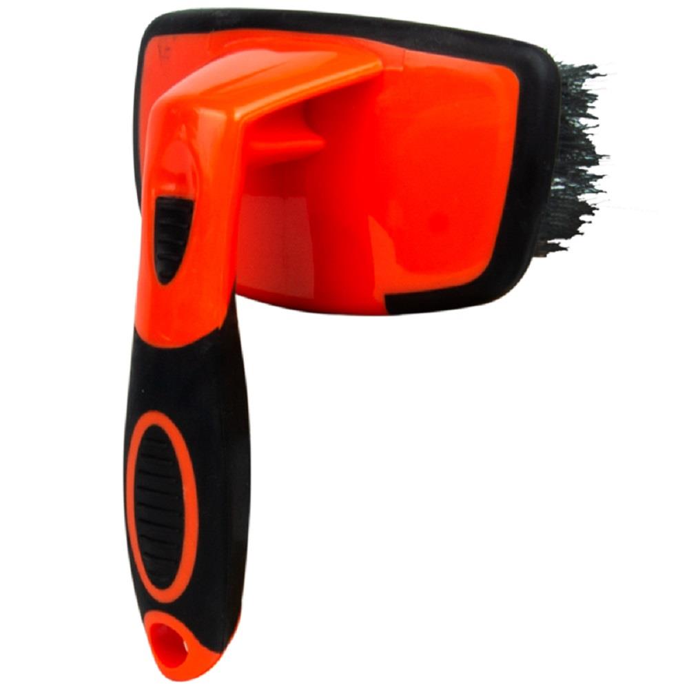 Sua alça projetada para fora da ponta, possibilita a aplicação de força máxima na limpeza. Sua textura emborrachada garante firmeza e segurança a empunhadura garantindo assim que não se tenha arranhões nas rodas em caso de colisão.