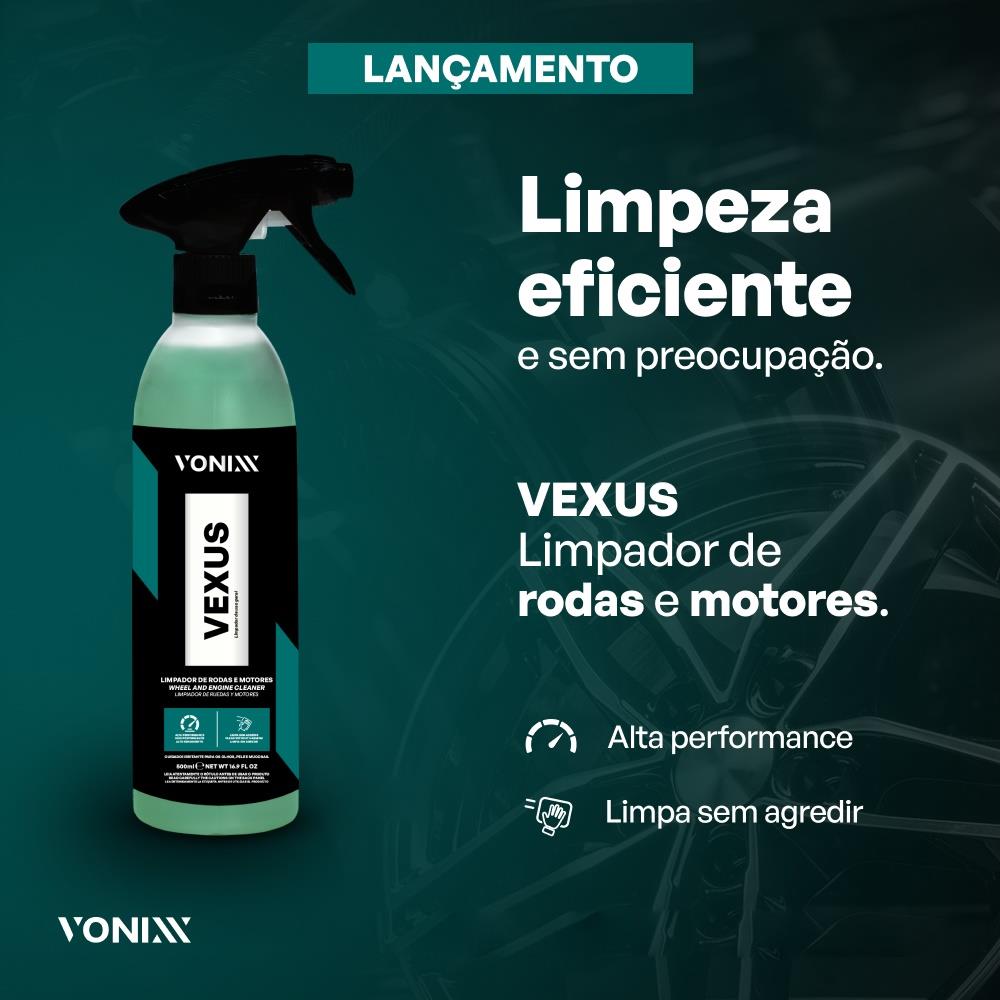 VEXUS é um limpador de alta performance, desenvolvido especialmente para limpeza de rodas e motores. O produto age na remoção da sujeira sem agredir as rodas e as partes do motor, seja plástico, pintura, borracha ou metal.